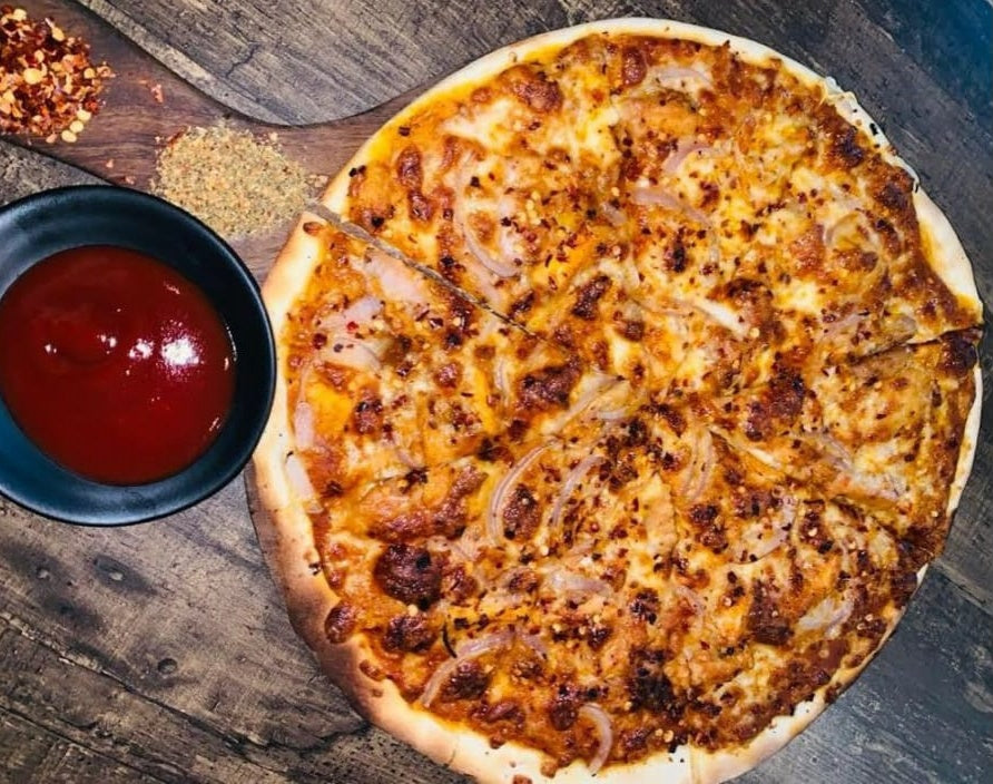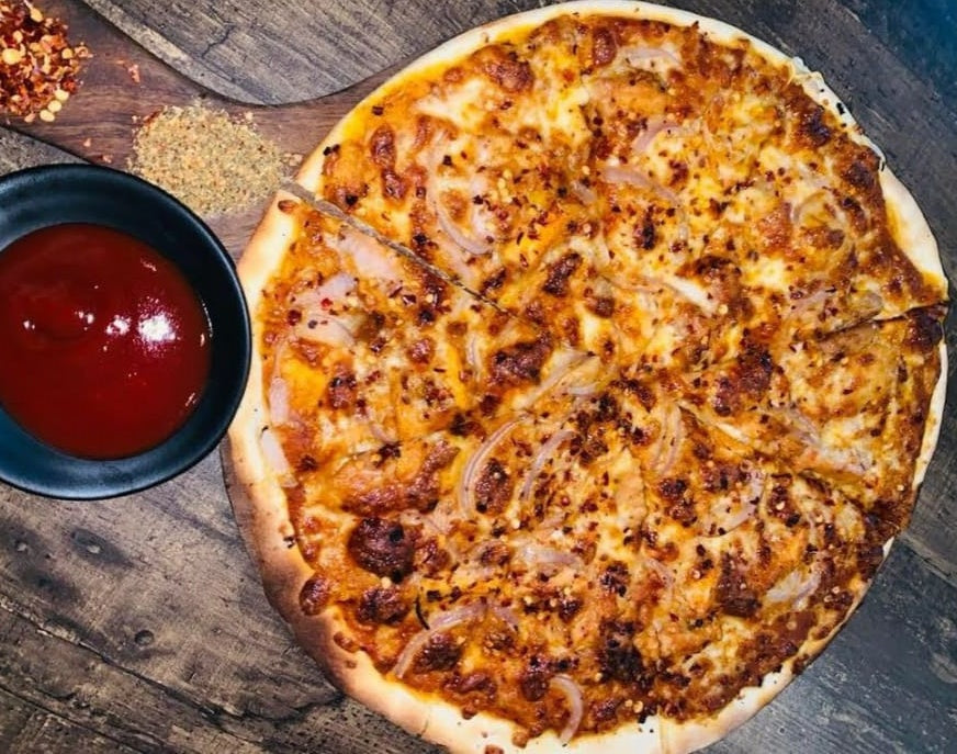 Tomatensauce, Mozzarella, Pouletfleisch und Zwiebeln