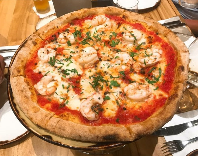 Tomatensauce, Mozzarella, Crevetten und Steinpilzen