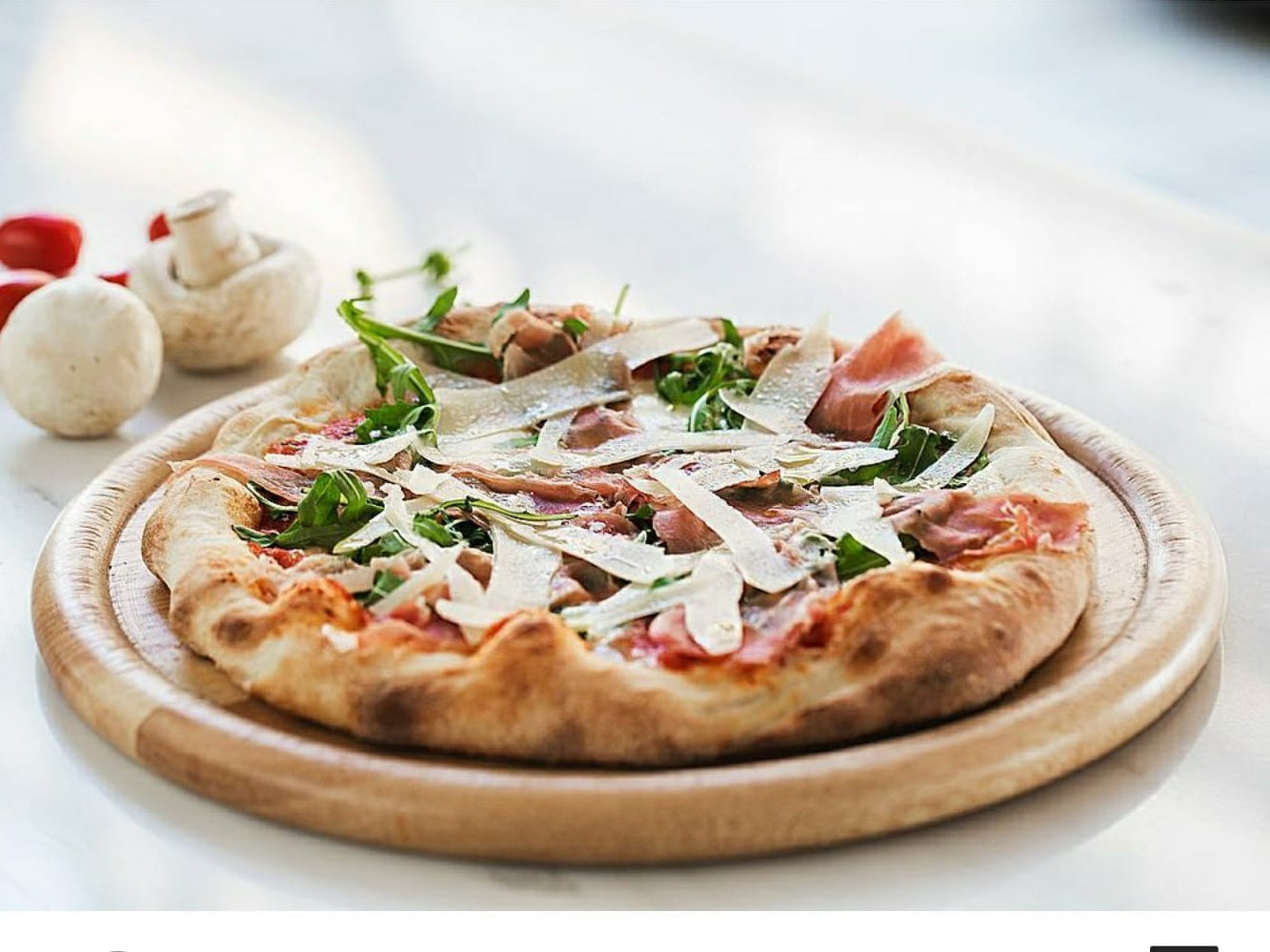 T.sauce, Mozzarella, Rohschinken, Parmigiano, Rucola und Basilikum