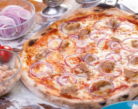 Tomatensauce, Mozzarella, Thunfisch und Zwiebeln